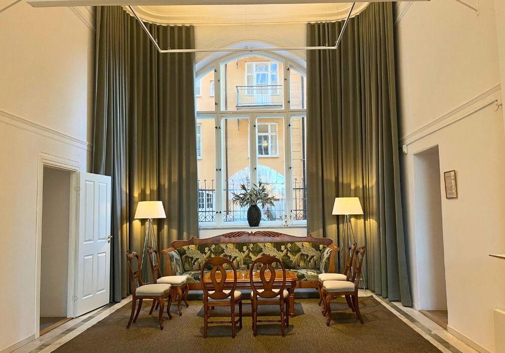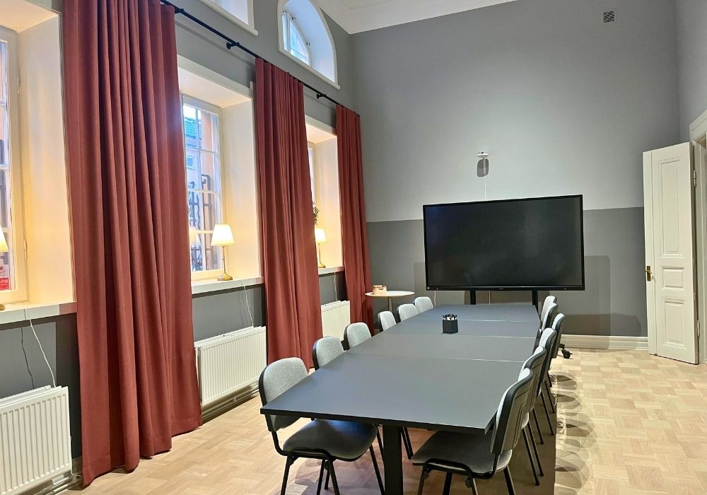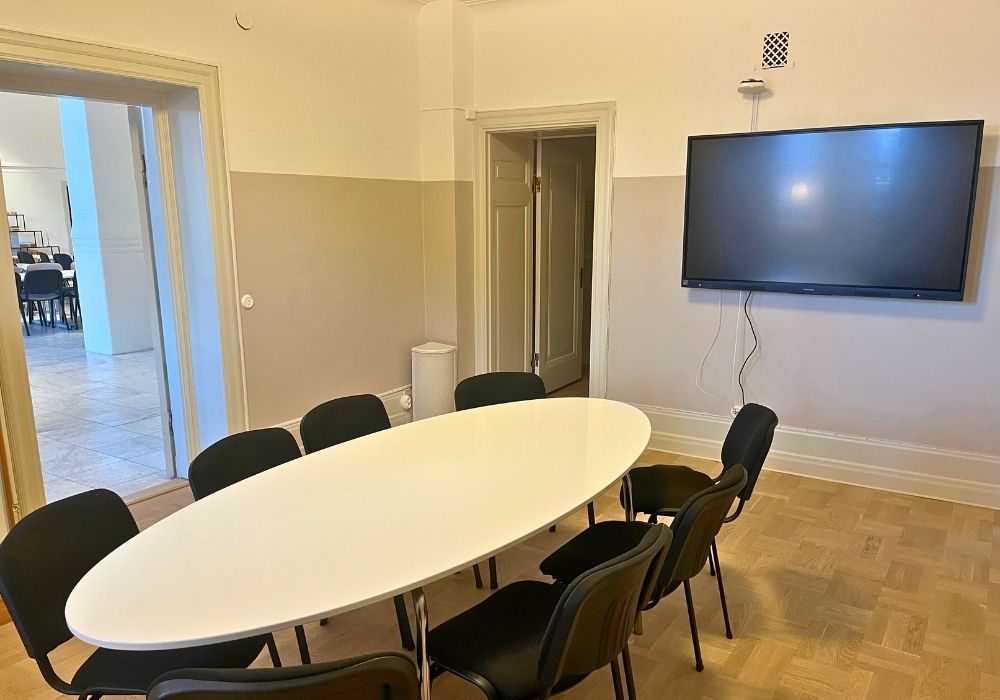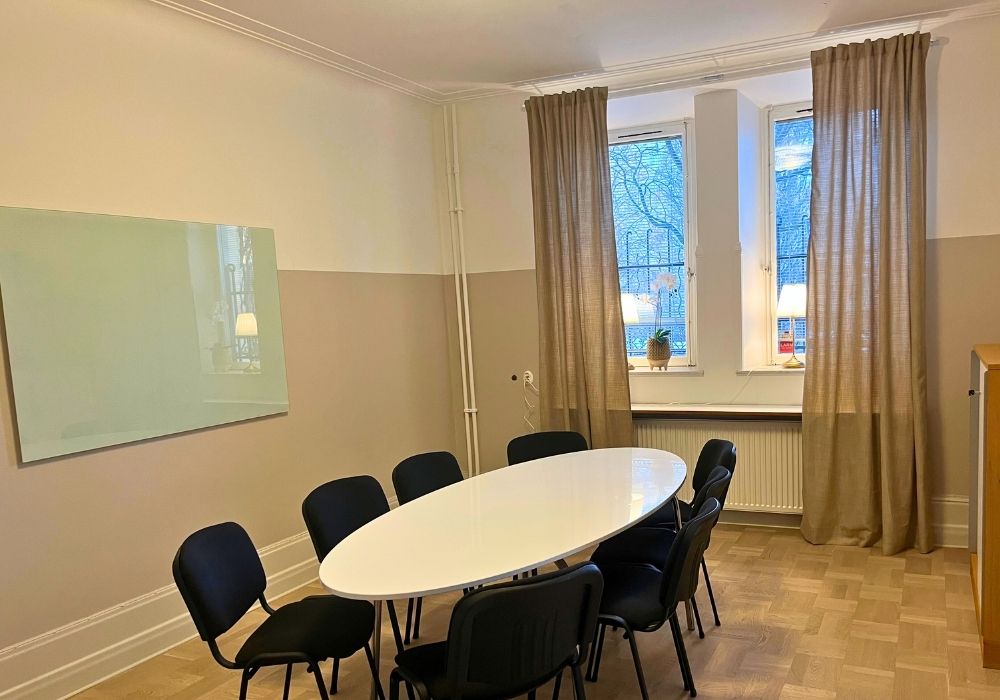 Ett effektivt och avskilt mötesrum med utsikt mot slottet. Rummet lämpar sig väl för mindre möten eller grupparbeten. Den rofyllda miljön skapar goda förutsättningar för fokuserade samtal och produktiva diskussioner.
