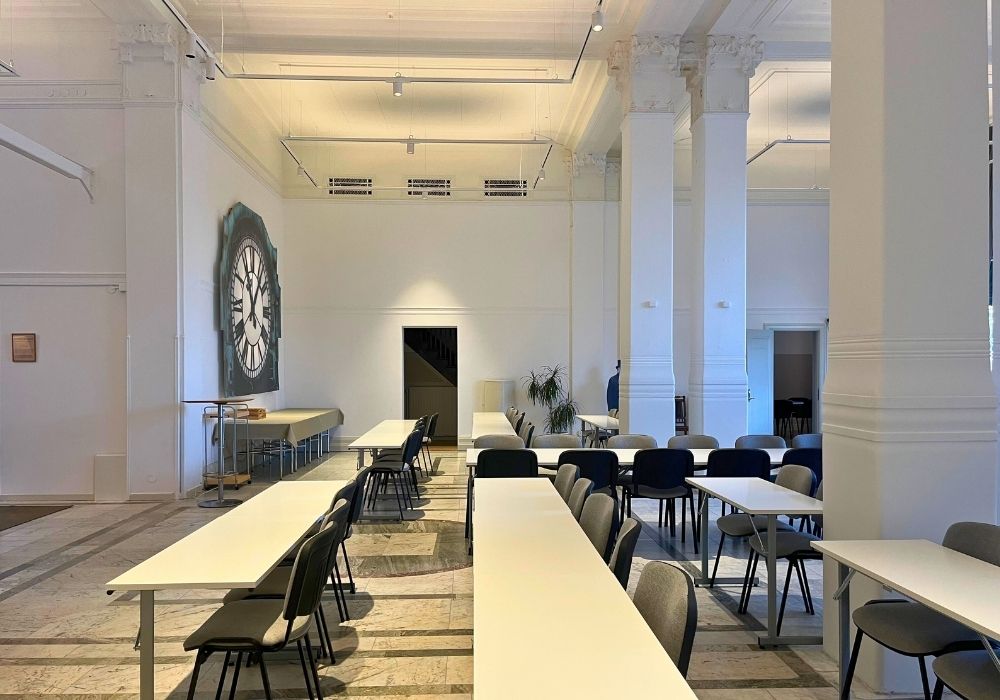 Stora Banksalen är en tidigare bankhall med en imponerande takhöjd på över fem meter. De ståtliga pelarna, de vackra stuckaturerna och det bevarade originalgolvet i marmor ger rummet en unik karaktär. Här möts historia och rymd i en miljö som lämpar sig utmärkt för större konferenser, föreläsningar, presentationer och event. Den generösa ytan ger stora möjligheter till flexibel möblering efter dina önskemål.